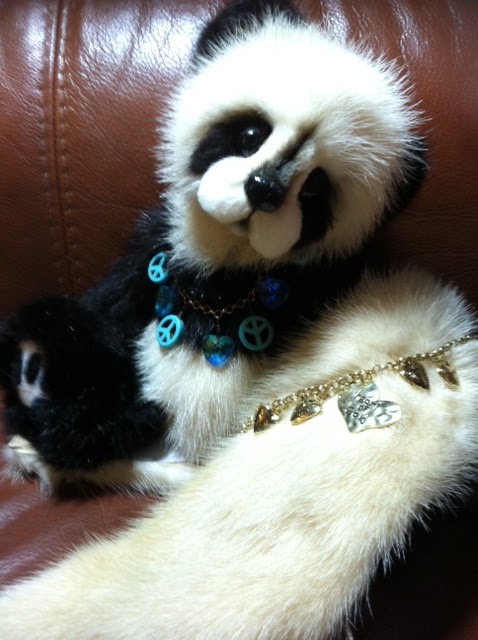 of my completed Peace and Love panda holding the gold necklace